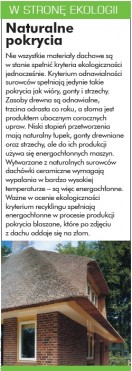 Podążanie za ekologią. Coraz większą wagę przywiązuje się do tego, aby materiały stosowane do konstrukcji dachu i jego pokrycia spełniały kryteria ekologiczności, tzn. możliwość ponownego wykorzystania, trwałość pokrycia, ważne jest również to, by były one wykonane z surowców odnawialnych, a ich energochłonność w procesie powstania była jak najniższa. Ważnym kryterium ekologiczności jest także zdrowie mieszkańców – warunek ten spełniają zarówno chemia użyta do budowy dachu, jak i materiały izolacyjne.